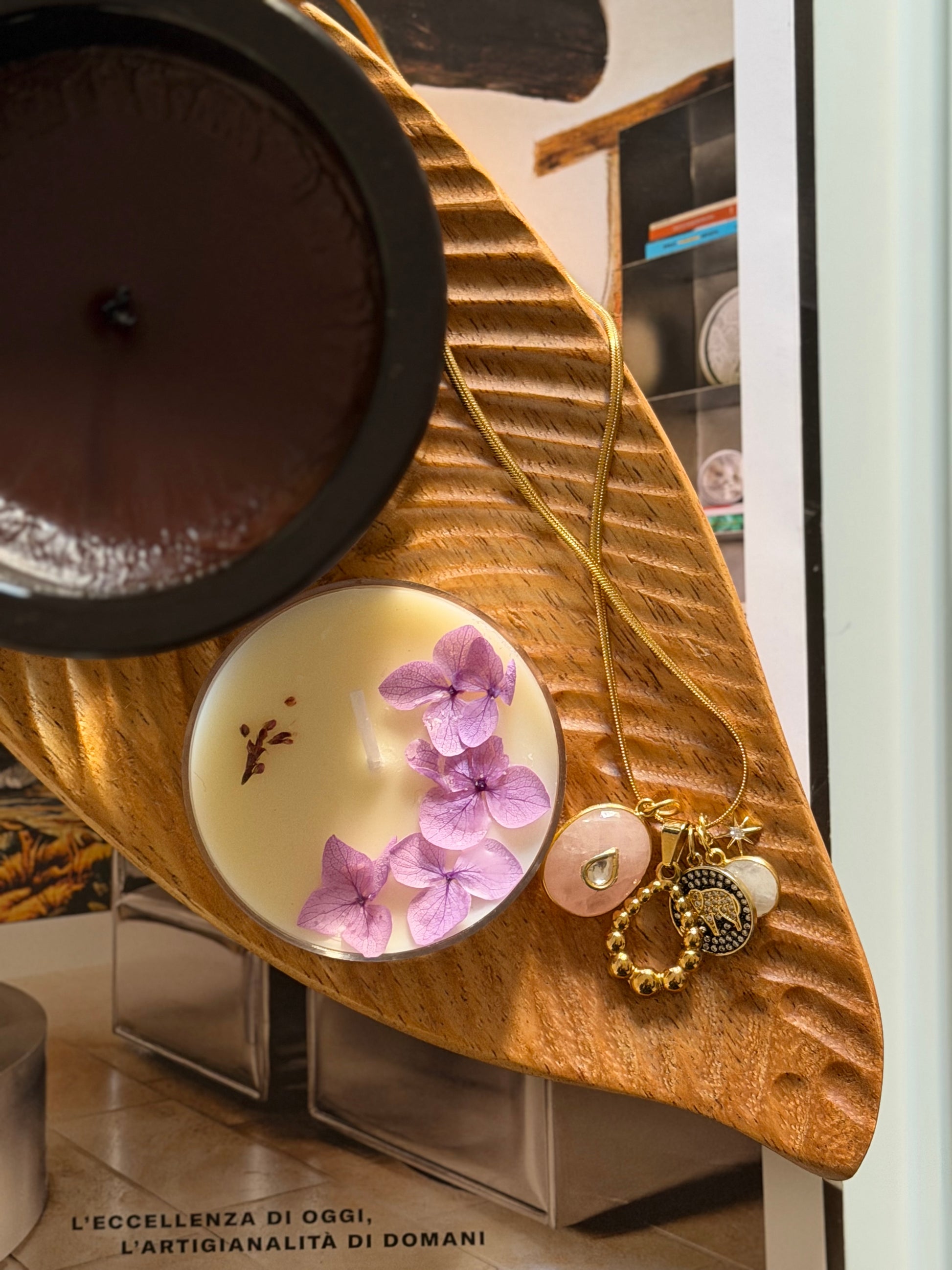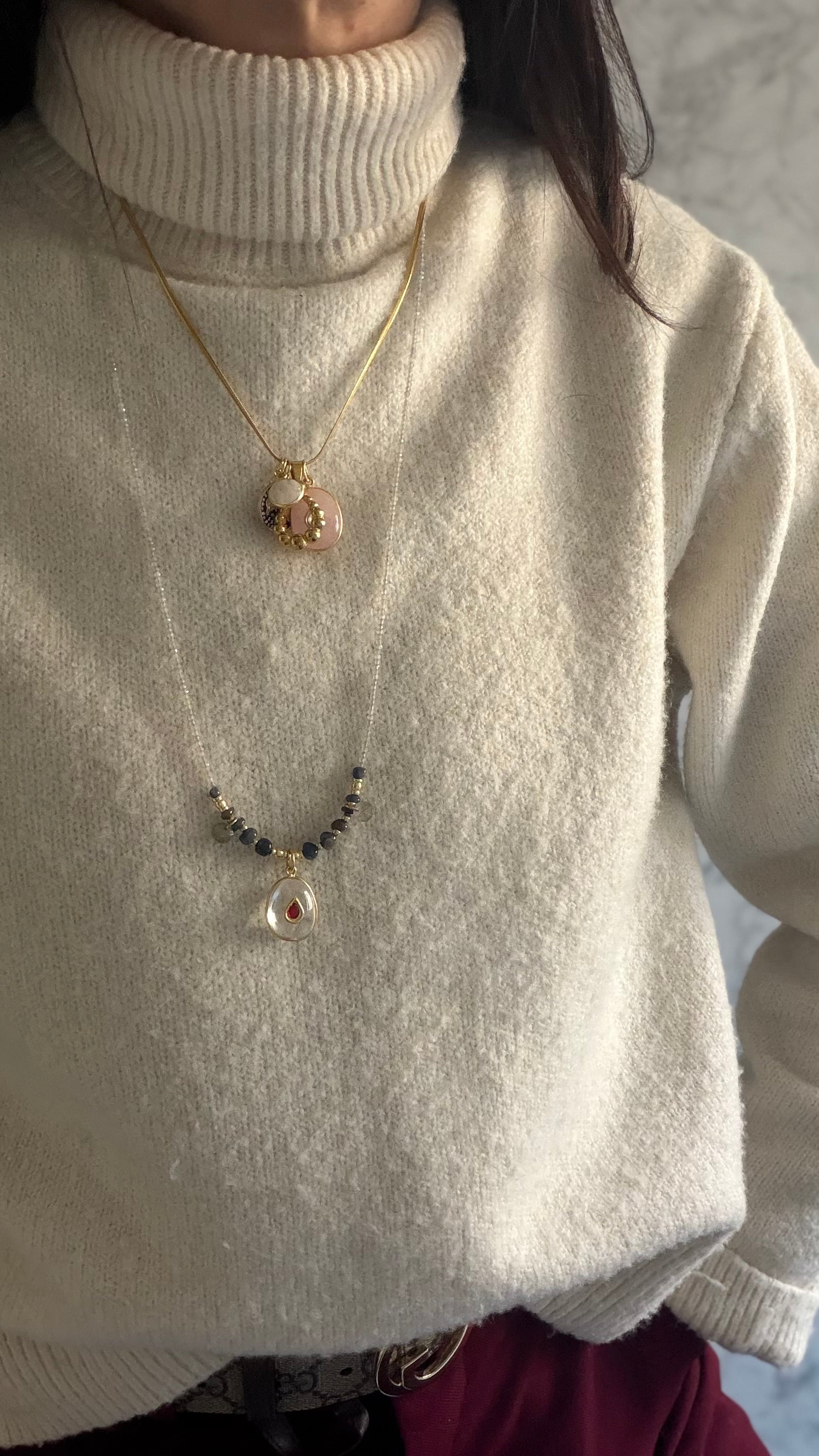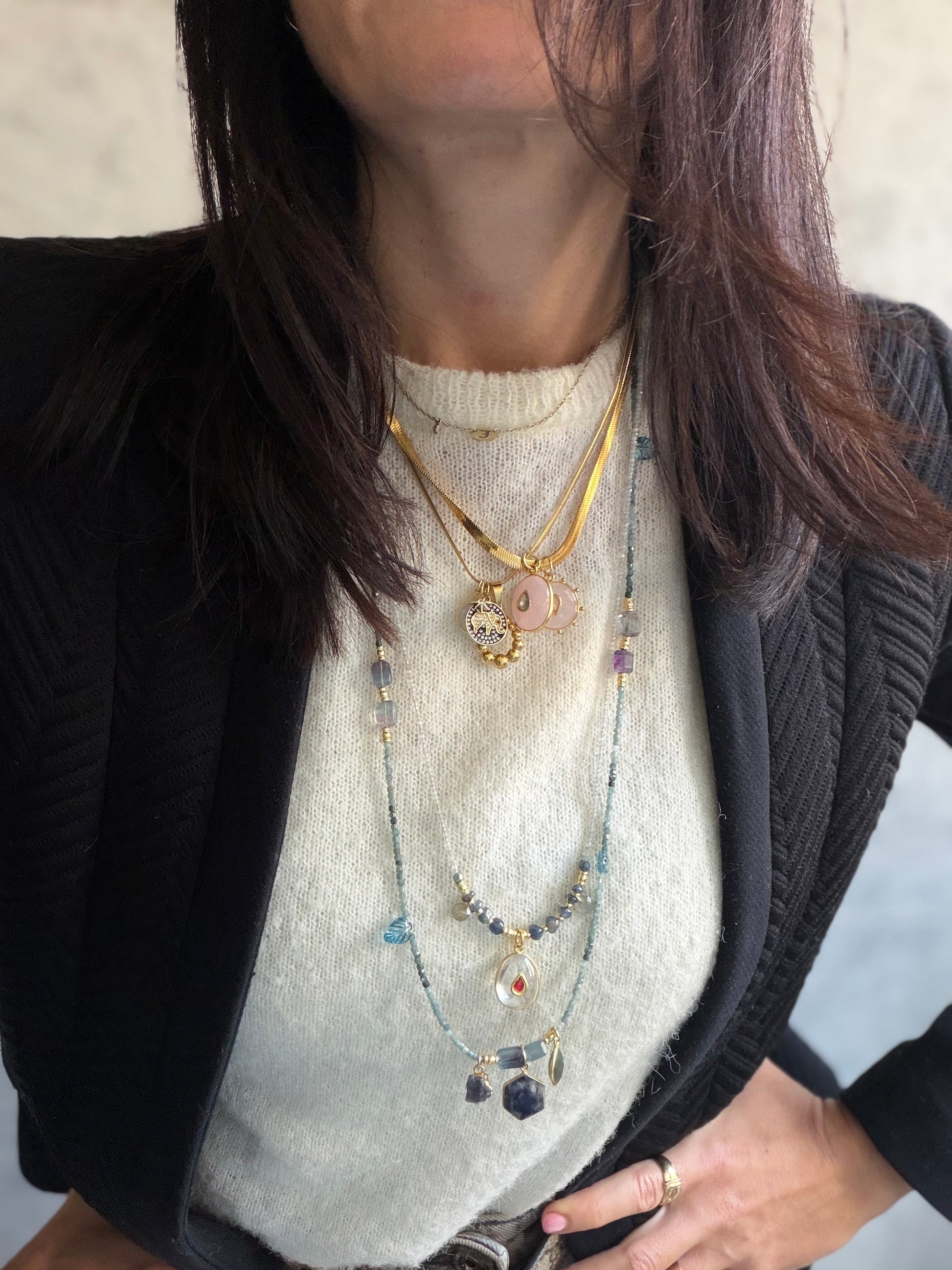 Catena in acciaio inossidabile pallacata oro con mix di ciondoli indiani, in quarzo rosa con castone centrale, occhio in pietra turchese, medaglia porta fortuna, lunghezza 40 cm.